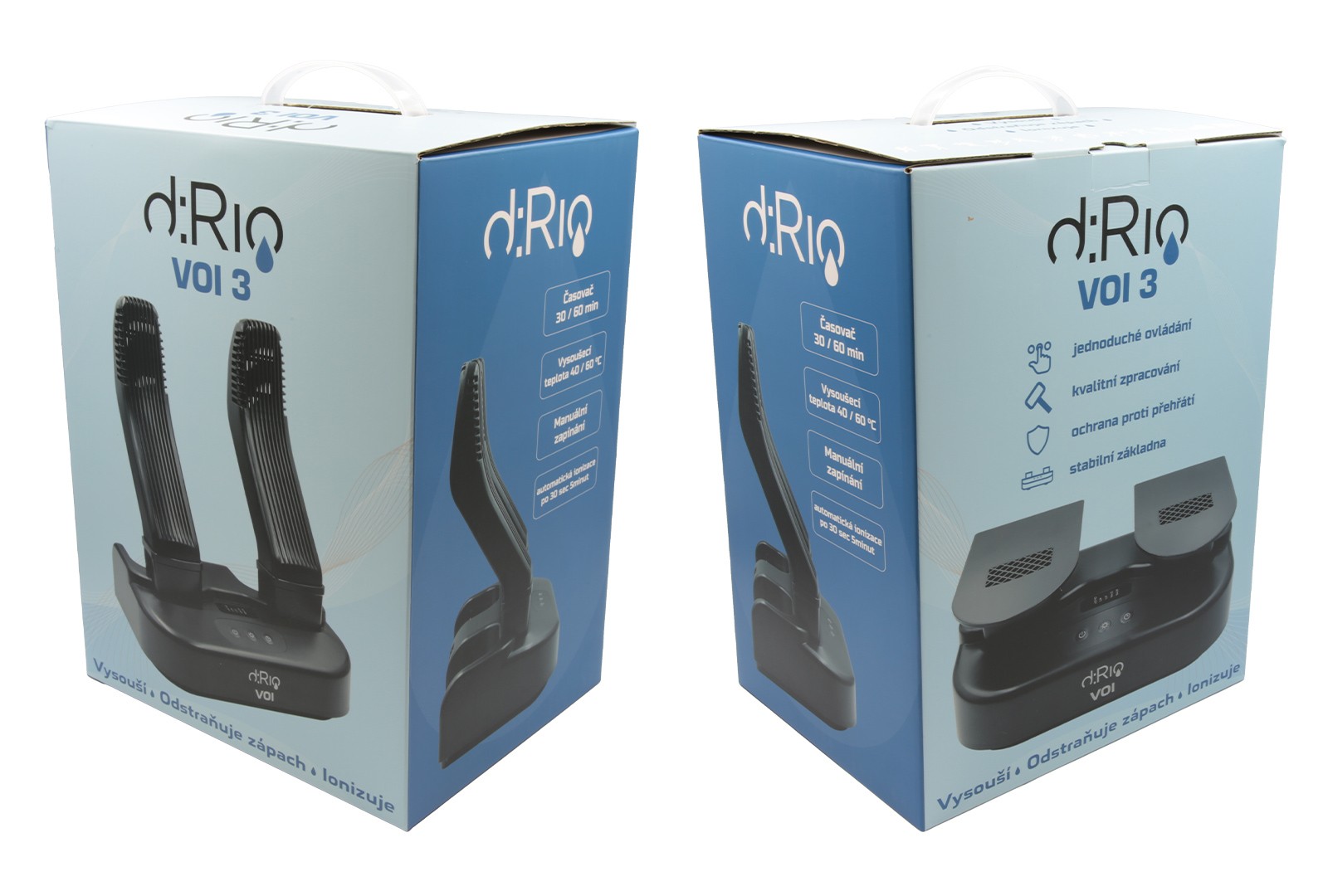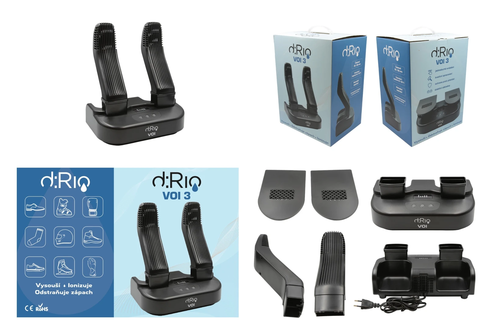 Whether you play sports, ride a motorcycle, go on nature trips or simply like your feet to be dry and warm, the d:Rio VOI 3 can become an irreplaceable helper for you. With this modern device, you can dry shoes, gloves, helmets and many other things. The d:Rio VOI 3 also functions as an ionizer that can remove up to 99% of bacteria and unpleasant odors. The dRio VOI 3 model offers very simple manual control with automatic shut-off. The package includes english instructions.