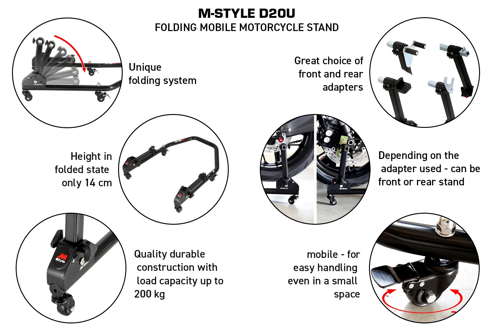 • despite the compactness, the load capacity of one stand is up to 200 kg on one side of the motorcycle