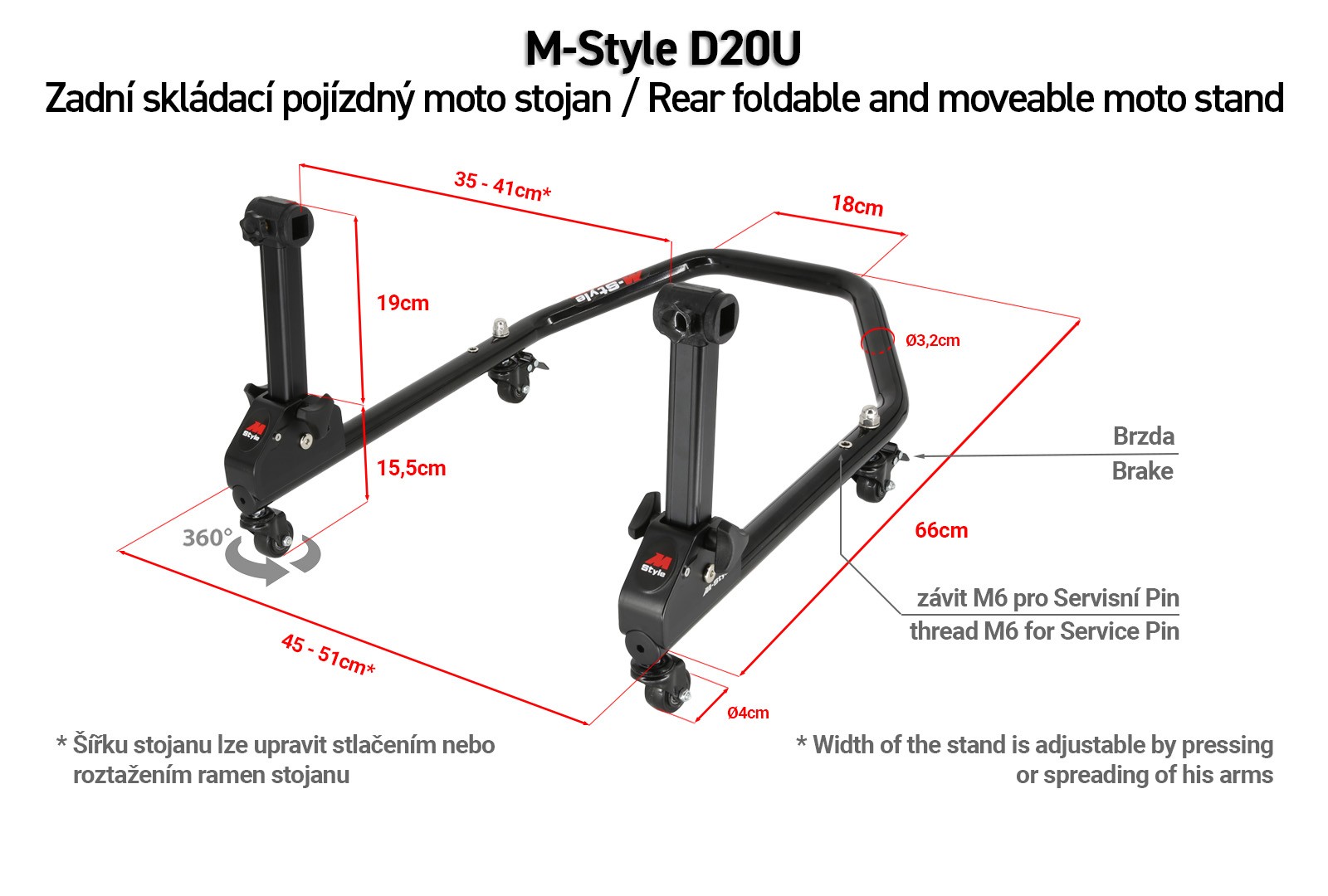 The new D20U paddock stand is unique product of our own design to deliver perfect performance and convenient ability to be quickly and easily folded for better storage and tansportation. This is thanks to the massive hand screw which firmly locks the arms of the paddock stand while being  convenient to operate. To assemble or disassemble the paddock stand for use or storage, all you have to do is loosen the screw and pull it out.