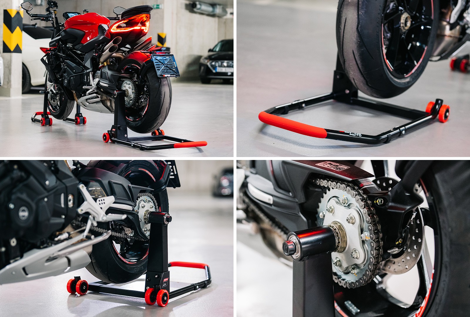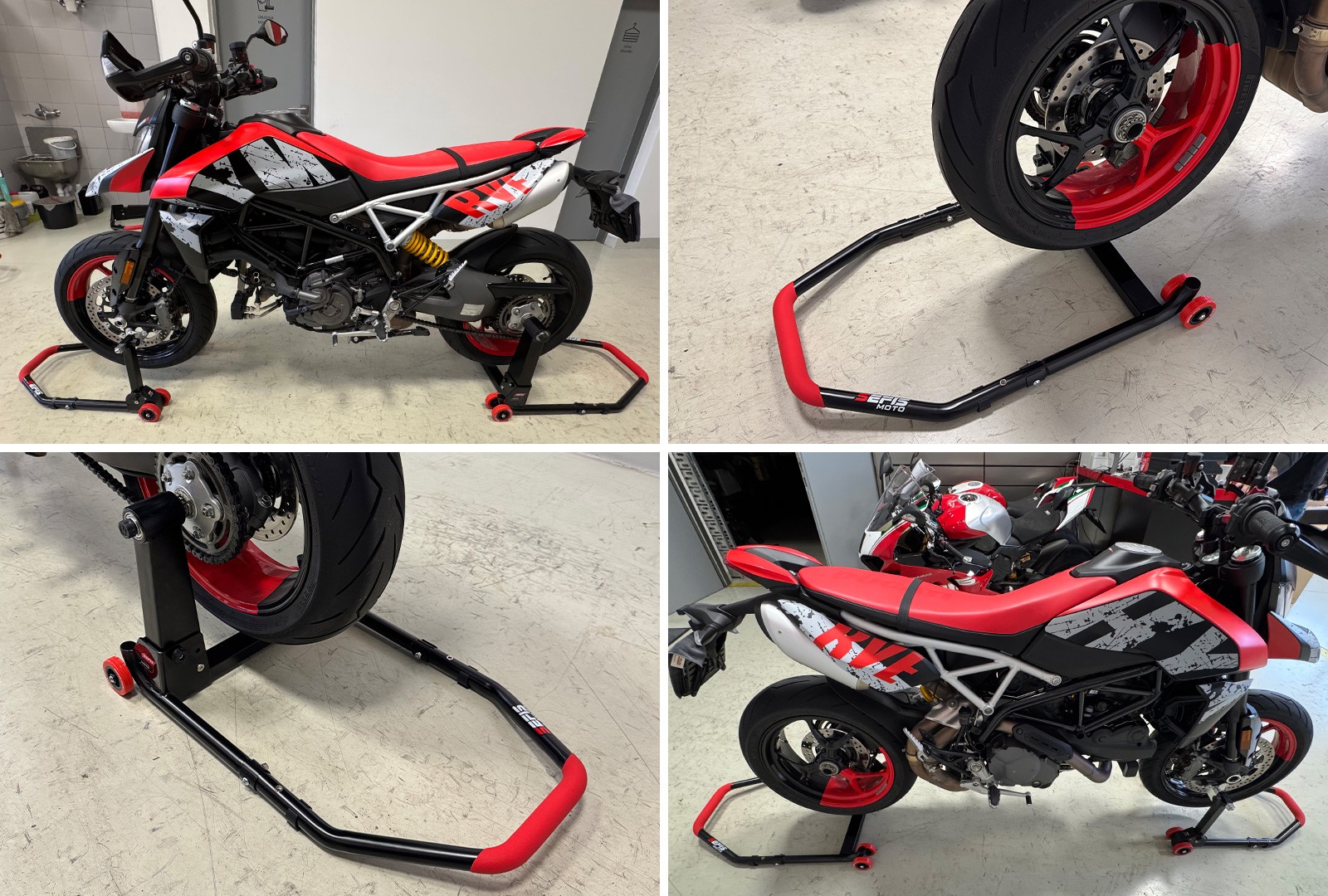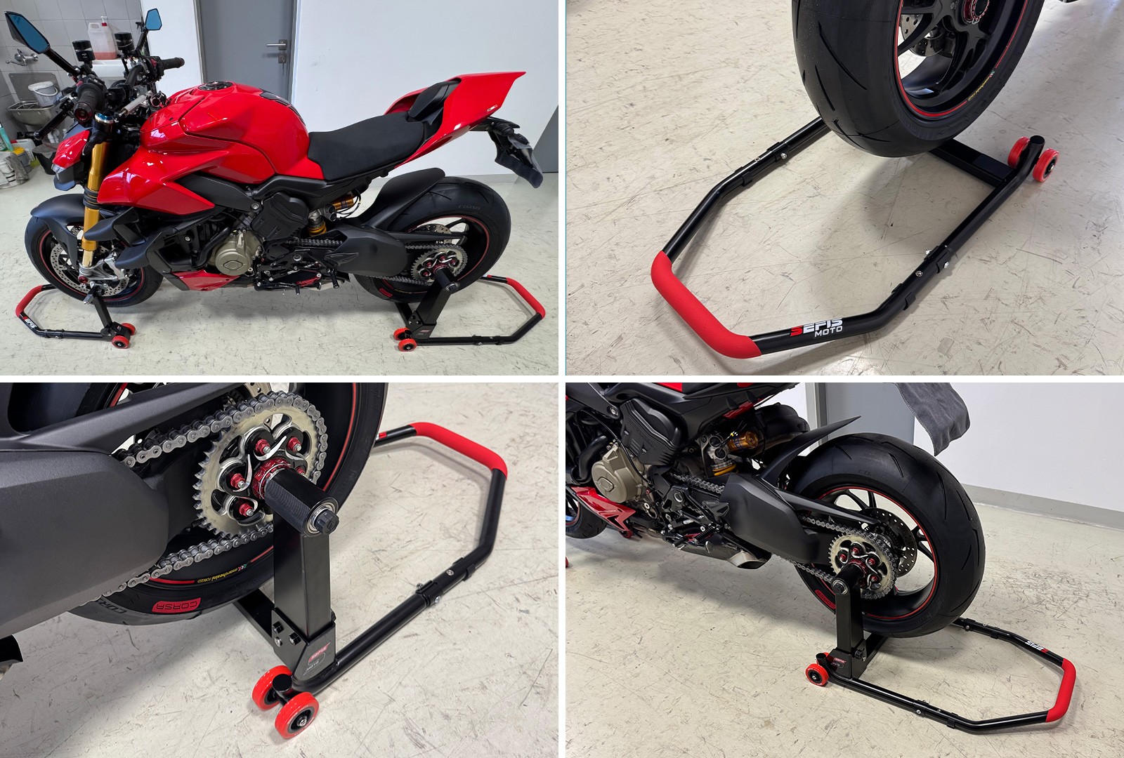 As with other modern SEFIS stands, the M22 also comes with an ergonomic rubberized handle. This not only looks good, but also provides a firm and reliable grip, ideal for comfortably lifting the motorcycle. In addition to comfort, the handle is also non-slip for better safety, especially when used in a workshop or when cleaning the chain with dirty hands or gloves.