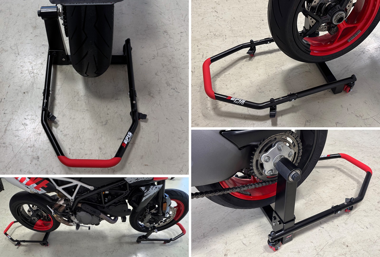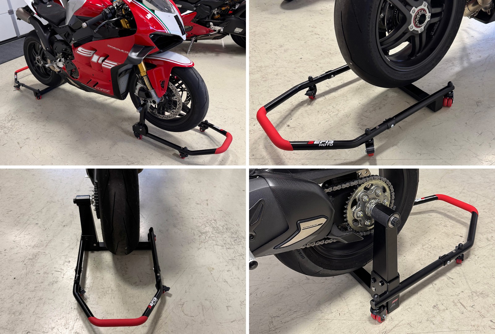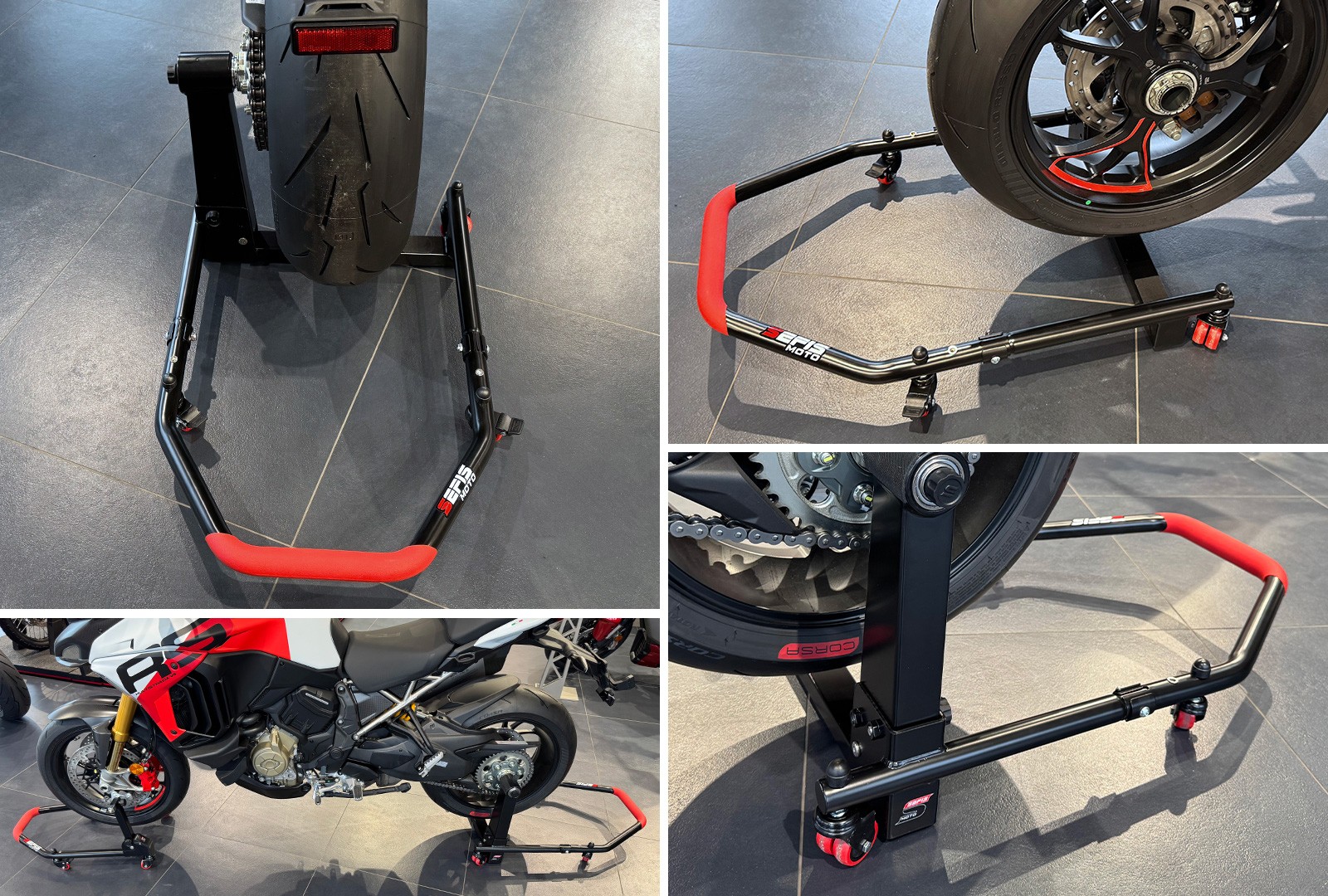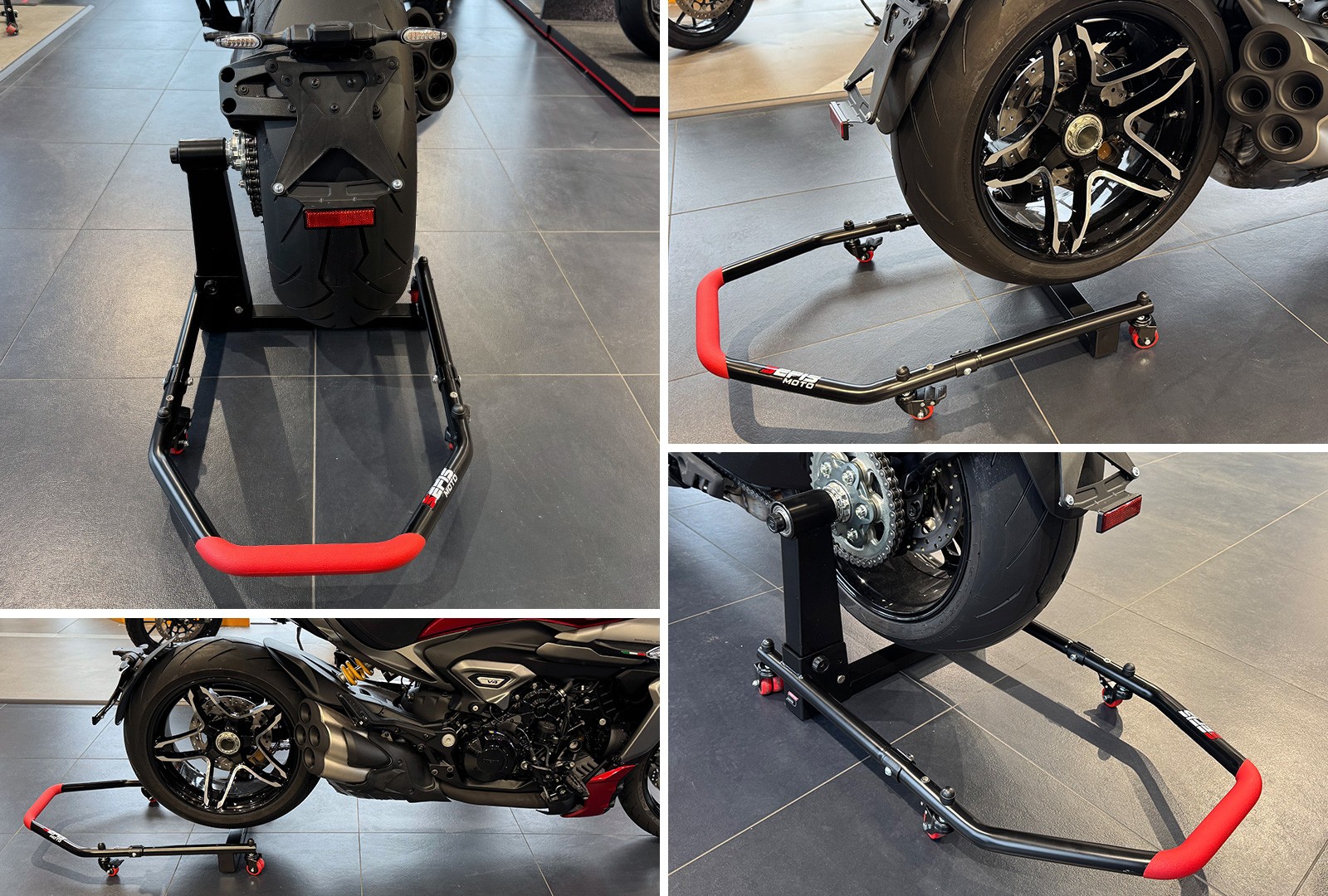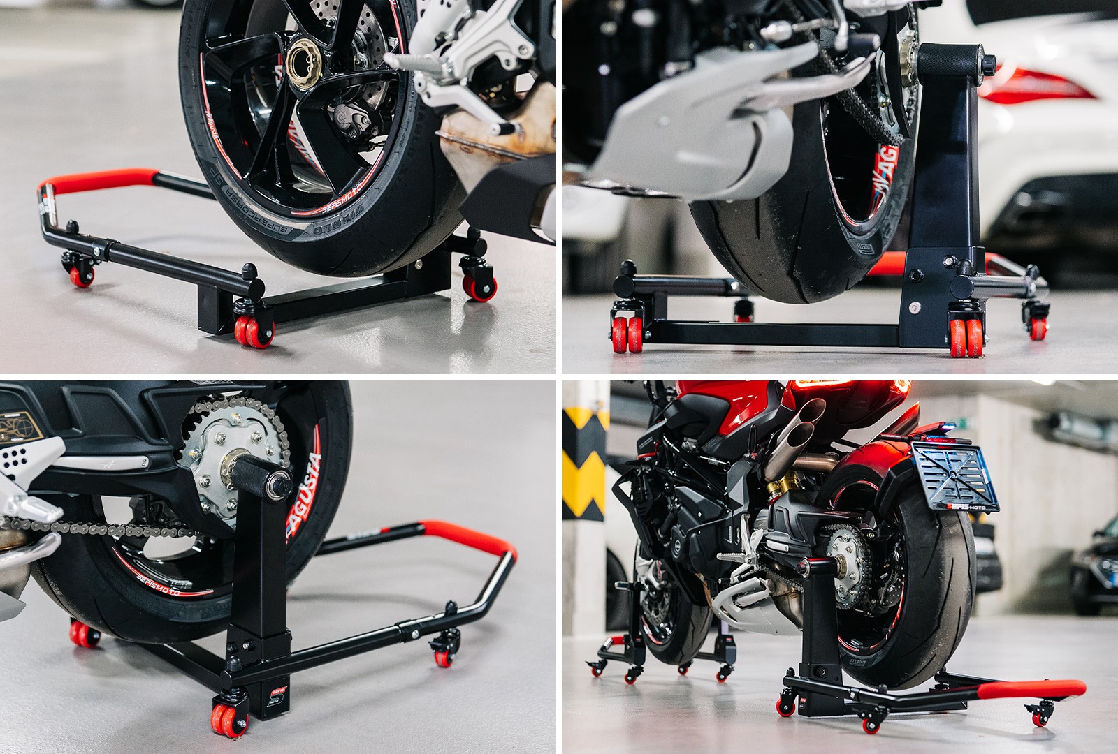 One of the main advantages of the M22U paddock stand is its full mobility in all directions. It allows incredibly easy handling of the motorcycle, even in a small space. It is thus ideal for maintenance as it allows you to turn the motorcycle as needed during work or, for example, to easily store it even in small garages with limited space.