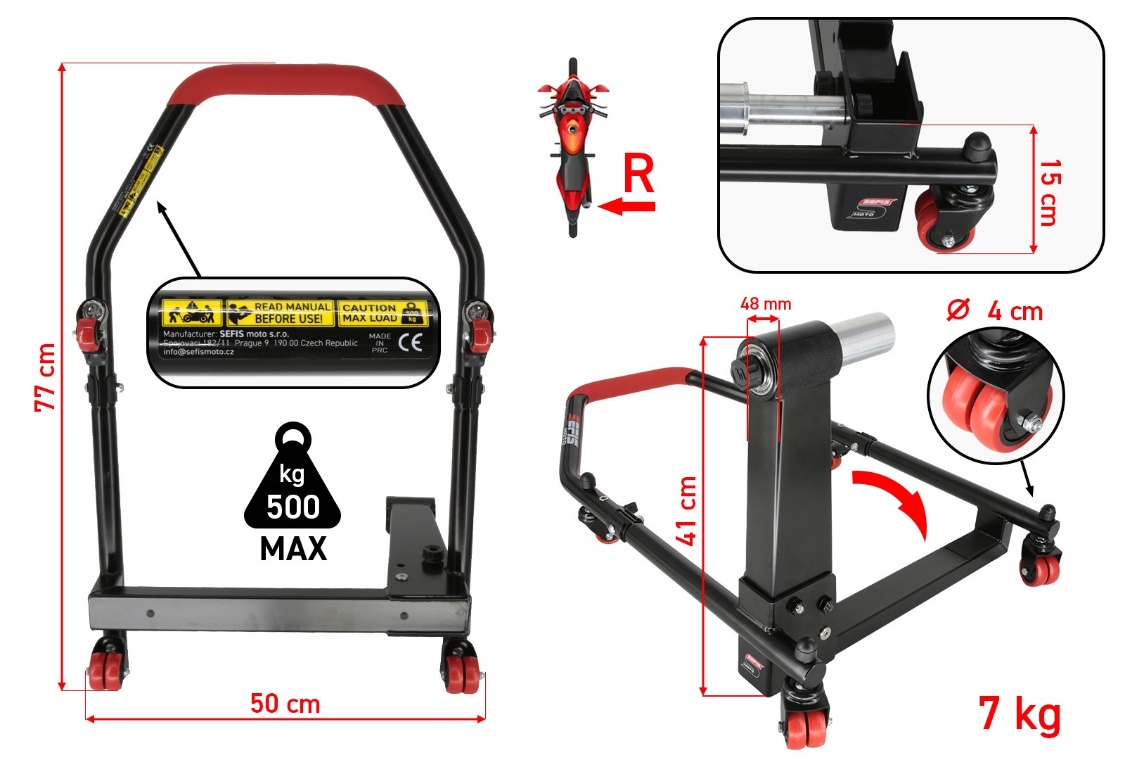 <h1 style="text-align: center;"><span style="font-size:28px;"><strong>SEFIS M20U foldable mobile universal front motorcycle stand</strong><strong></strong></span></h1><div class="row"> <div class="col-md-6"> <p><span style="font-size:22px;"><strong><br /> <br /> <br /> <br /> <br /> Unique folding folding system</strong></span><br /> <span style="font-size:16px;"><br /> The new M20U paddock stand is unique product of our own design to deliver perfect performance and convenient ability to be quickly and easily folded for better storage and tansportation. This is thanks to the massive hand screw which firmly locks the arms of the paddock stand while being convenient to operate. To assemble or disassemble the paddock stand for use or storage, all you have to do is loosen the screw and pull it out.<br /> <br /> In addition, the M20U stand received a number of other improvements, such as an even stronger, robust all-metal steel structure, improved and more stylish wheels or an ergonomic rubberized handle.</span></p> </div><div class="col-md-6"> <div style="text-align:center"><img alt="" src="https://sefismoto.cz/image/produkty/stojany_a_prislusenstvi/m20u/m20u-animated-long1.gif" /></div> </div> </div><div class="row"> <div class="col-md-6"> <div style="text-align:center"><img alt="" src="https://www.sefismoto.cz/image/produkty/stojany_a_prislusenstvi/m20u/m20u-long-2.jpg" /></div> </div><div class="col-md-6"> <p><span style="font-size:24px;"></span></p> </div> <span style="font-size:24px;"> </span><p><span style="font-size:22px;"><b>Four high-quality full swivel wheels</b></span></p><div> <p><span style="font-size:16px;">One of the main advantages of the M20U paddock stand is its full mobility in all directions. It allows incredibly easy handling of the motorcycle, even in a small space. It is thus ideal for maintenance as it allows you to turn the motorcycle as needed during work or, for example, to easily store it even in small garages with limited space especially if a car or another motorcycle is already parked there. With the M20U paddock stand sliding the motorcycle effortlessly in a narrow space will no longer be a problem.<br /> <br /> You don't have to worry that the stand will move where it shouldn't either. Both rear wheels are equipped with a highly efficient and very comfortable to operate foot brake. While you can easily turn the stand with the motorcycle with one hand while the wheels are unlocked, once the brake is activated it's nearly impossible to move. And despite the wheels, the M20U paddock stand offers exceptional stability to the motorcycle as it can be moved without any danger of toppling over.<br /> <br /> The M20U stand requires a flat surface to function properly like a smooth concrete floor of garages, workshops, and warehouses.</span></p> </div> <span style="font-size:20px;"></span></div><div class="row"> <div class="col-md-6"> <p style="text-align: right;"><span style="font-size:20px;"><strong></strong></span></p><h2><span style="font-size:28px;"><strong></strong></span></h2><h2><strong><span style="font-size:20px;"></span></strong><span style="font-size:20px;"></span><br /> <br /> <br /> <br /> <br /> <span style="font-size:22px;"><strong>Durable construction with a load capacity of up to 200 kg</strong></span></h2><div><br /> <strong></strong></div> <span style="font-size:16px;">The M20U stand boasts an even more durable and truly robust all-metal steel construction from the adapter holder to the folding mechanism. It can thus handle not only a proper one-time load, but also long-term heavy duty use. Its load capacity is up to 200 kg on one side of the motorcycle. It should be noted that the stand only supports one wheel and therefore only holds half the weight of the entire motorcycle and can therefore be used with motorcycles up to 400kg in weight.</span><p style="text-align: right;"><strong></strong></p> </div><div class="col-md-6"> <div style="text-align:center"><img alt="" src="https://www.sefismoto.cz/image/produkty/stojany_a_prislusenstvi/m20u/m20u-long-3.jpg" /></div> </div> </div><div class="row"> <div class="col-md-6"> <div style="text-align:center"><img alt="" src="https://www.sefismoto.cz/image/produkty/stojany_a_prislusenstvi/m20u/m20u-long-4v2.jpg" /></div> </div> <p><span style="font-size:22px;"><b>Large selection of front and rear adapters</b></span></p><p> </p><p><span style="font-size:16px;">The M20U folding stand is suitable for most motorcycles. To adjust the width of the stand, the adapters can be positioned to the sides, and even if this is not enough for unusually narrow or wide motorcycles, the stand itself can be compressed or stretched by up to another 5 centimeters with your hands without any permanent damage. Which adapter to choose for your machine?</span></p><p><span style="font-size:16px;"></span></p><p><span style="font-size:16px;"><b></b></span><span style="font-size:16px;"><strong>Front:</strong><br /> <strong>Pins </strong>- for motorcycles that have a hole from the bottom of the forks<br /> <strong>Forks</strong> - For motorcycles with axial or radial brakes<br /> <br /> <strong>Rear:</strong><br /> <strong>Hooks</strong> - for motorcycles with rollers<br /> <strong>Paddles</strong> - for motorcycles that do not have rollers for lifting directly behind the swinging fork<br /> <br /> <strong>Universal:</strong><br /> <strong>2in1 </strong>- can be used as a hook or as a front single</span><br /> <span style="font-size:16px;"></span><br /> <br /> <br /> </p> <span style="font-size:18px;"><strong><span style="font-size:22px;"><strong></strong></span></strong></span></div><div class="row"> <div class="col-md-6"> <h3 style="text-align: center;"><strong></strong></h3><h3 style="text-align: right;"><strong></strong></h3><h3><strong><span style="font-size:14px;"></span><span style="font-size:18px;"><strong><span style="font-size:22px;"><strong><br /> <br /> <br /> <br /> Easy and ergonomic use</strong></span></strong></span></stron
