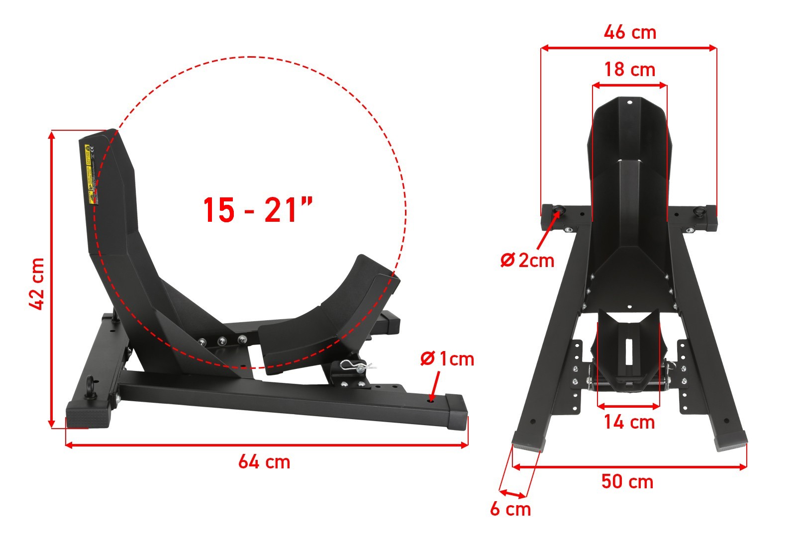 The C20 wheel chock is fully adjustable and you can use it to transport or park most motorcycles and scooters. Accommodates wheels with a diameter of 15-21 inches and a width of 100-130 millimeters. This makes it suitable for transporting or parking small scooters as well as large touring enduros. This makes it suitable for transporting most types of motorcycles. To change the wheel size, simply unscrew, move and screw the stand cradle back on.