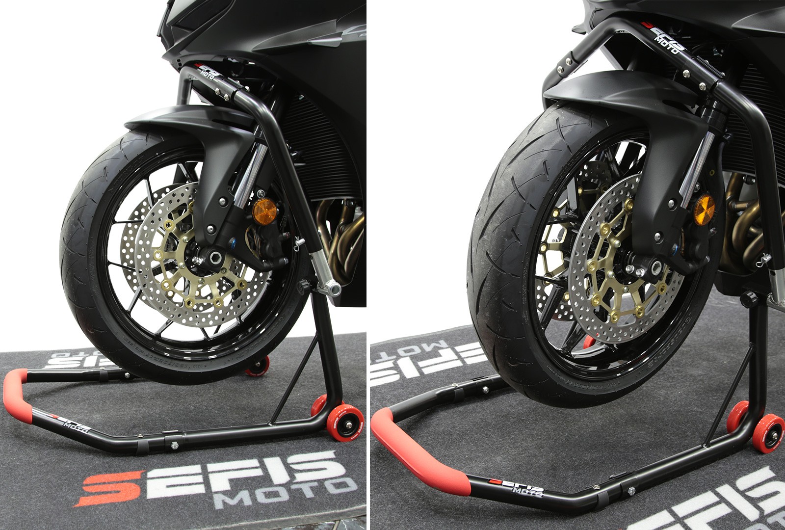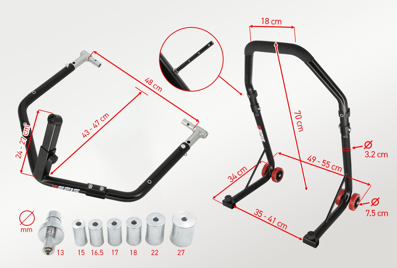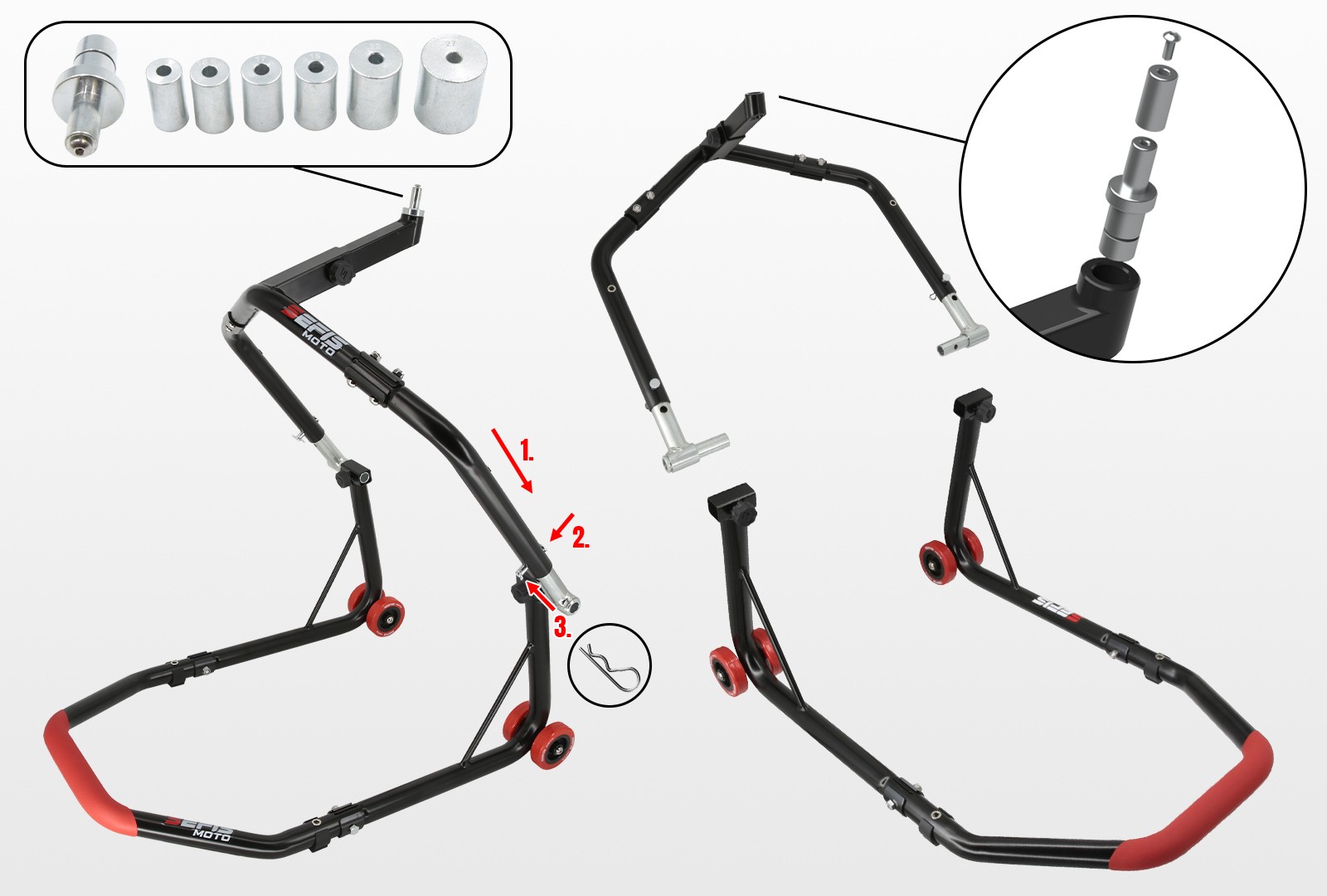 The head lift paddock stand stand consists of two parts, the D18 rear body and a steering neck extension. The extension can be easily removed which will allow you after purchase of rear adapters to use the D18 body as rear paddock stand.