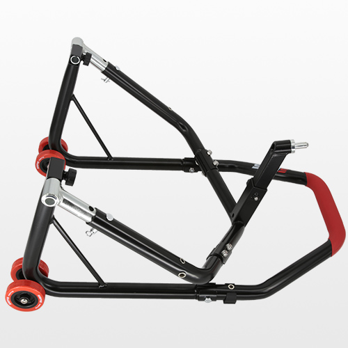 D18 paddock stand is equipped with dual wheels made from combination of hard plastic and softer PVC. This ensures good stability on both smooth and rough surfaces. The wheels are large enough to move smoothly over even rough asphalt and outer PVC prevents slipping on tiles or smooth concrete.