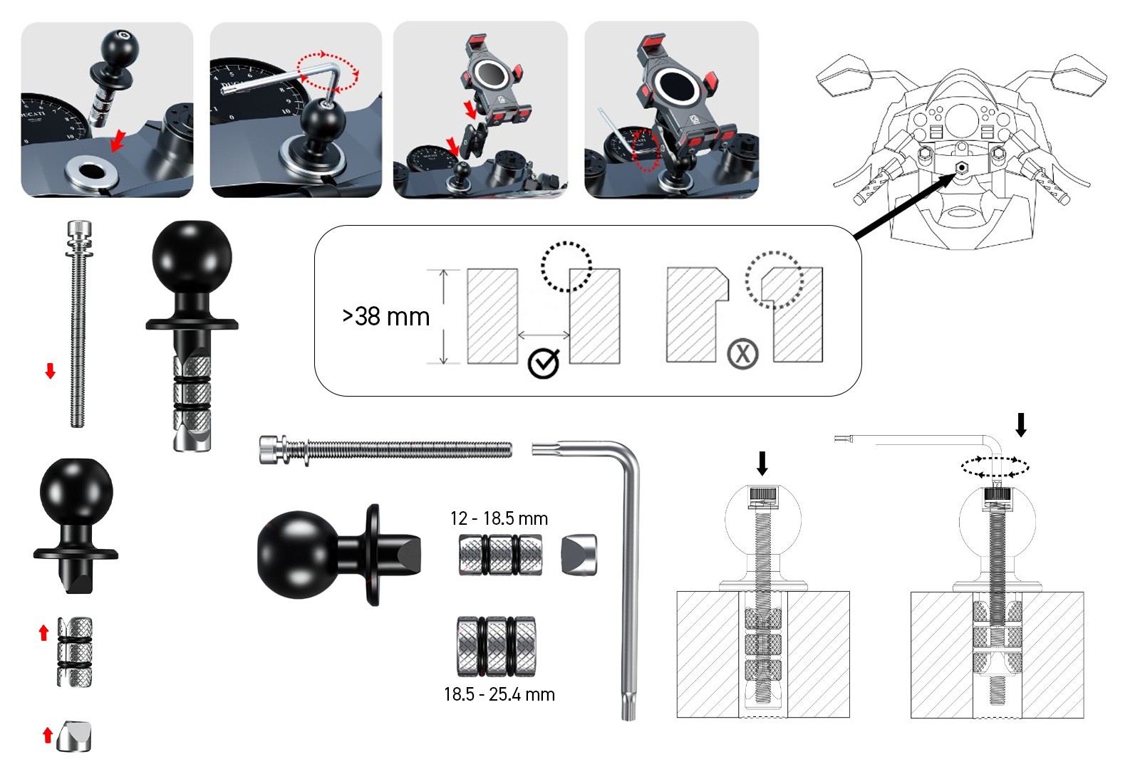 This Grab phone holder comes with an S-ball steering wheel adapter that can be used in both round and hex steering wheel holes ranging from 12 to 25.4 millimeters. The adapter comes with two sizes of expansion inserts, making it easy to install and will fit securely into almost any type of steering wheel hole.