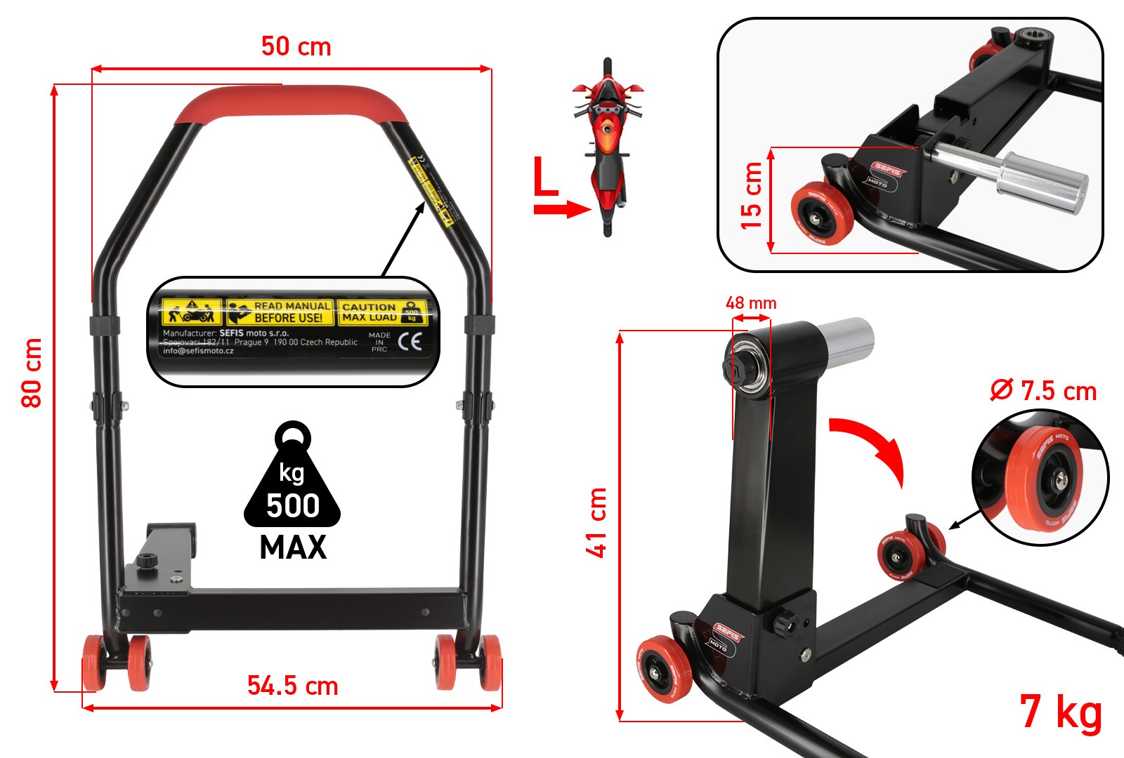 Motorcycles with swing arm require the right stand for lifting and servicing. With the SEFIS M22 folding stand, this will not be a problem. It is easy to handle and anyone can lift the motorcycle without any help. The left-sided swingarm rear stand is The left-hand flying stand is suitable for motorcycles of all brands, which can be found in the adapter table.